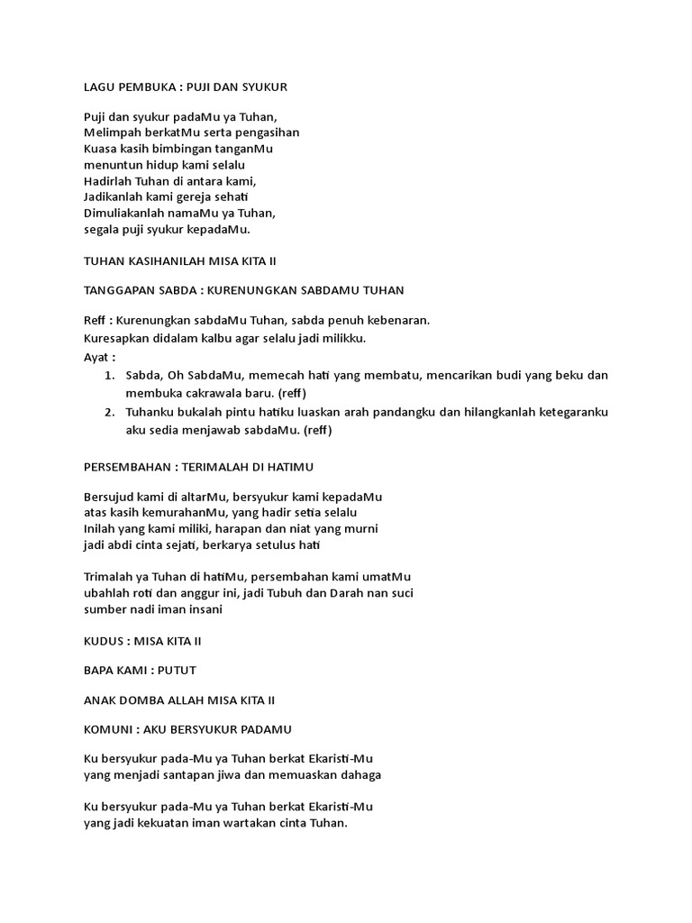 Lirik Lagu Syukur Padamu Oh Tuhan - Nyanyian dari buku puji syukur.