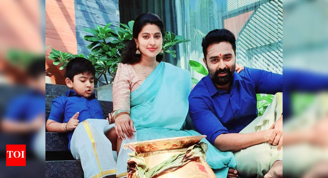 Sneha Daughter / Sneha looked gorgeous in an yellow raw silk long skirt teamed with a contrast blue and gold brocade crop top.
