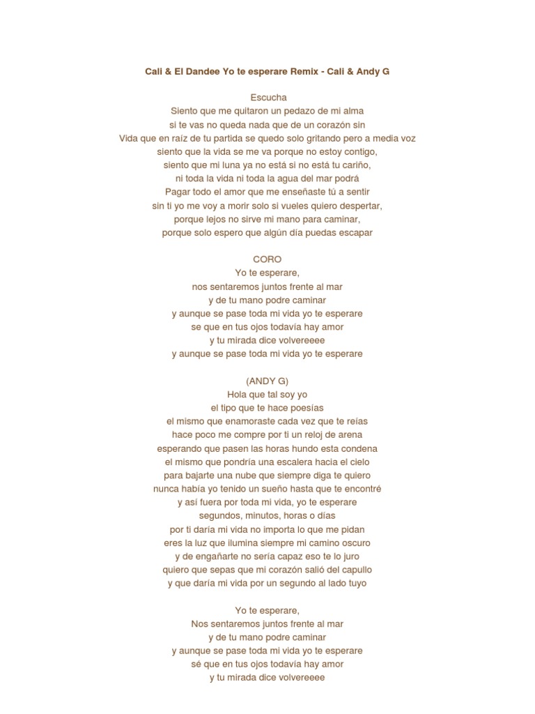 Yo Te Esperare Lyrics By Cali El Dandee Yo Te Esperare No Sé que algún día volverás, y pase lo que pase yo te esperaré, nos sentaremos juntos frente al mar y de tu mano podré caminar y aunque se pase toda mi vida yo te esperaré sé que en tus ojos todavía hay amor y tu mirada dice.